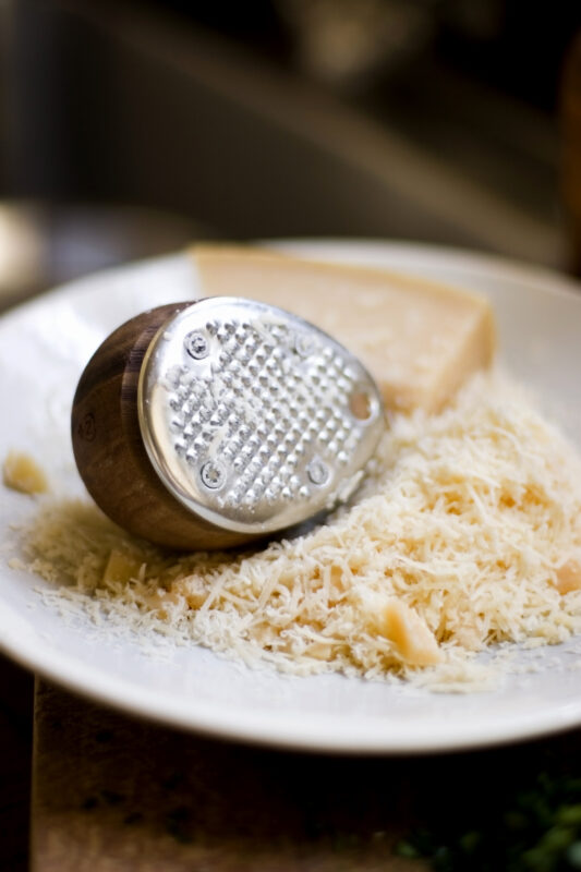 Egy karakteresebb ízvilágú olasz sajtból inkább kevesebb kerül bele: a pecorino jellegzetes ízű érlelt juhsajt, amit pehelyszerűen finomra lehet reszelni a kézi reszelőnk legapróbb lyukú oldalán.