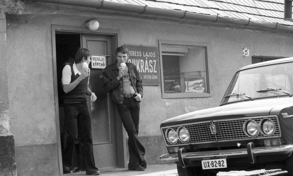 Életérzés. 1975, a cukrászda ajtajában Verrasztó Zoltán és Hargitay András úszó. Bokor utca 27. / Kép forrása: Fortepan, adományozó: Urbán Tamás