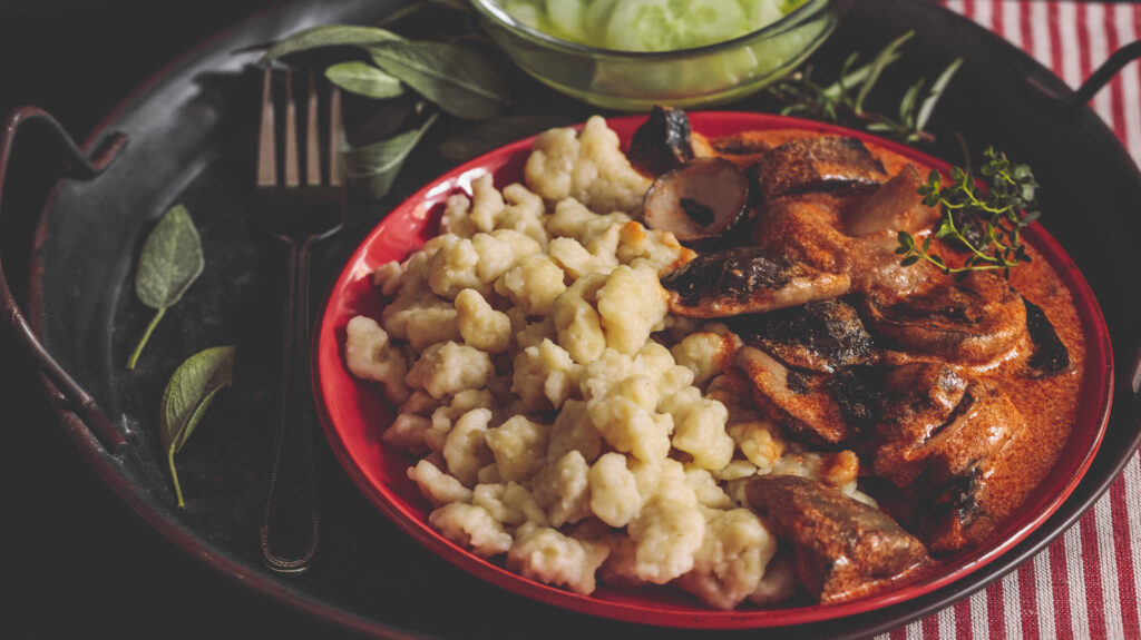 Galuska, avagy nokedli: gombapaprikás nokedlivel és uborkasalátával. (Fotó: Eva-Katalin, Getty Images)