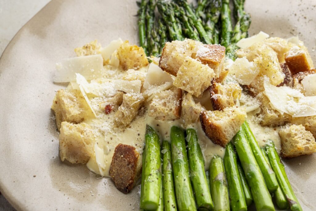 Hoppá! Cézársaláta készülhet spárga főszerepléséhez is. Mint tudjuk, az eredeti cézársaláta nem tartalmaz feltétet, sem csirkét, sem garnélát. Ezek csak pluszban hozzáadhatók az autentikus recepthez. A spárgacézár is a legendás saláta újragondolása, amelyben az eredeti alapanyagokon kívül diadalmaskodik a spárga. A kenyértől laktató; a parmezán, a szardella, a tojássárgája és a Worcestershire-szósz ad neki olyan ízrobbanást, aminek köszönhetően méltán a saláták egyik örök sztárja.