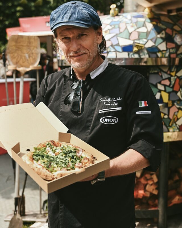 Szabadfi Szabolcs jelenléte nélkül szomorú is lenne a Gourmet Fesztivál. Az ország kovászos pékje persze az első perctől kint pörgött a fesztiválon, személyesen is süt, kiszolgál, társalog, fotózkodik, a pizzája pedig a fesztivál egyik befutója. Pedig „csak” egy pizza ugyebár a sok luxusfogás között. Az n’dujás pizzája minden magyar kolbászrajongónak kötelező, ez a csípős olasz kolbászspecialitás jól csúszik nekünk is. A Mangalica a virágoskertben nevű tételen a mangalicasonka mellé málna kerül, és imádják egymást!