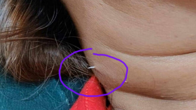 Otthon, amikor egy fájdalomcsillapító tapaszt készült felhelyezni a nyakára, masszírozni kezdte a fájó területet. Ekkor valami hegyes, tűszerűt érzett a bőre alatt, ami azonban egy kis nyomás hatására átszúrta a bőrét.
