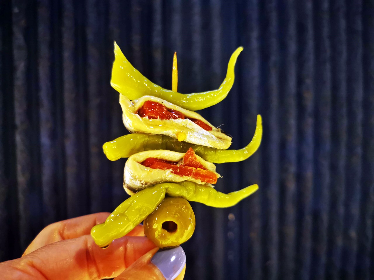 Itt aztán minden van, méghozzá úgy elkészítve, hogy akkor is el lehessen fogyasztani, ha az egyik kezünkben pohár, a másikban meg az étel van. A legtöbbször nyársra tűzik a dolgokat, de egészen elképesztő variációkban. Mindenfélével töltött olajbogyók, sajtok, marinált halak, polipok, kagylók és garnélák, kolbászok és grillezett zöldségek, meg amit még el tudunk képzelni, bármi mehet a nyársra.