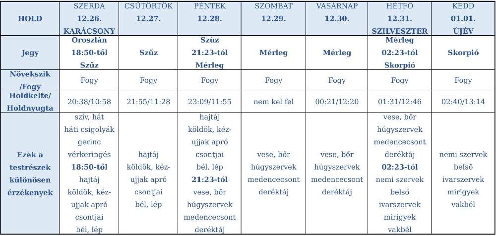 VASÁRNAP – december 30.: Szokatlan módon ma nem vált jegyet a Hold. Tehát mára szó szerint ugyanaz vonatkozik, ami a tegnapi napra. Közben ne felejtsd el, hogy a szellőztetés most különösen jól járja át a lakásodat! Persze, azért legyél óvatos, nehogy megfázz a kereszthuzatban. A szobanövényekre, a kis állatokra is ugyanez érvényes.