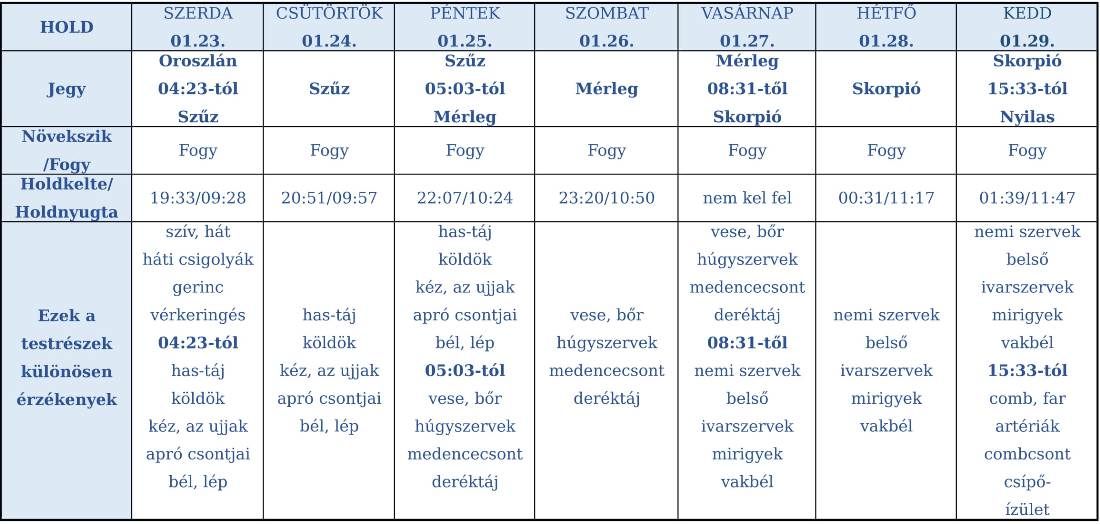 CSÜTÖRTÖK – január 24.: Ma egész nap a Szűzben jár a Hold, ami valójában a szerdai nap tökéletes mása. Ráadásul másik két bolygó is föld jegyben jár ma, melyekkel a Hold szerencsésen kapcsolódik. Ettől fegyelmezett és hatékony leszel a munkában és az egészséged megőrzésének ügyében is. Amit tegnap elolvastál, ma megveheted, megeheted, megihatod. Jót fog tenni.