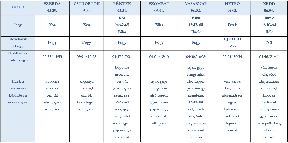 PÉNTEK – május 31.: A Bikába lépő Hold egész másfajta tevékenységeknek kedvez mától. Mivel még fogy a Hold, ugyanakkor a péntek vénuszi nap, a szépítkezés nem is lehetne aktuálisabb. Szőrtelenítésre, gyantázásra, peelingre, bőrtisztításra, körömápolásra, kozmetikára tökéletes ez a péntek. Nemcsak önmagadat, a környezetedet is megszépítheted virágokkal, színes párnákkal, valójában bármivel, amit a lelkedben érzel.