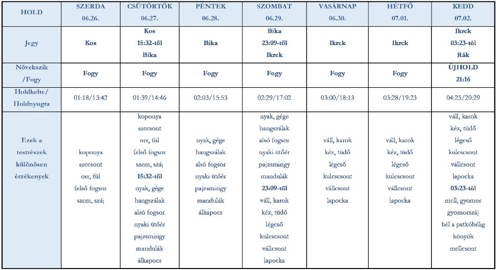 SZOMBAT – június 29.: A mai napon csak késő éjjel vált jegyet a Hold, ezért a szombat is kiváló nap a szépítkezésre. Még fogy a Hold, ami továbbra is hatékonnyá teszi a szőrtelenítést. Nem csak önmagadat, a környezetedet is szépítheted: a lakásodat, a balkonodat, a kertedet. Pillanatok alatt csodát tudsz varázsolni, ha szánsz erre kicsi időt.