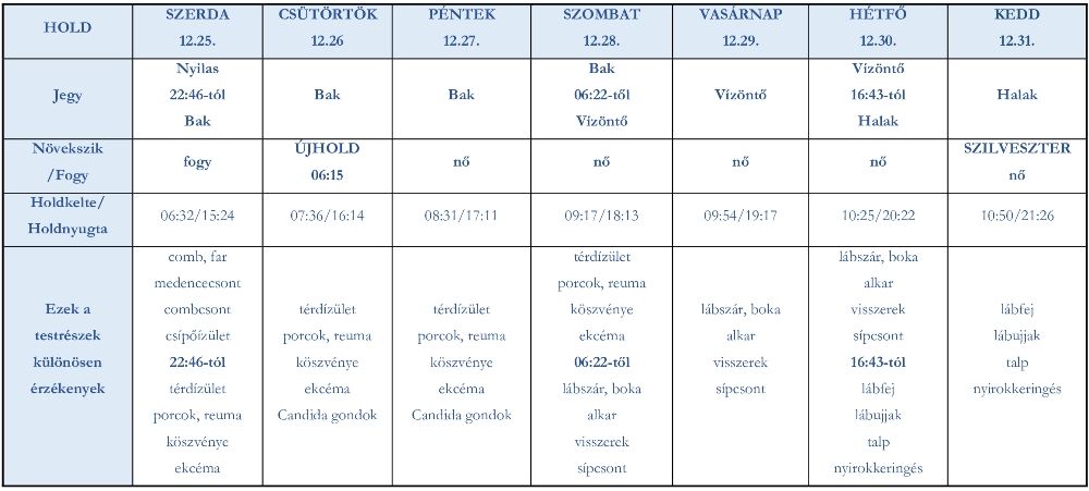 CSÜTÖRTÖK – december 26.: Kora reggel lesz újhold a Bak jelében, amit valószínűleg átalszol az előző napi lakoma miatt. Ha felébredsz, gyújts halványzöld gyertyát, és kívánj valamit! Nyisd ki a szemed és a szívedet az újdonságokra! Minden, amire most rászánod magad, manifesztálódni kezd. Az újholdról részletesen a táblázat alatt olvashatsz.