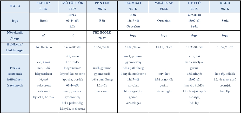 PÉNTEK – január 10.: Telihold napján semmit ne erőltess magadra! Inkább állj meg egy pillanatra, és döntsd el, mit kell elengedned, miről érdemes leszoknod. Nem késtél el az új évi fogadalmakkal sem. A januári teliholdról részletesen olvashatsz a táblázat alatt.