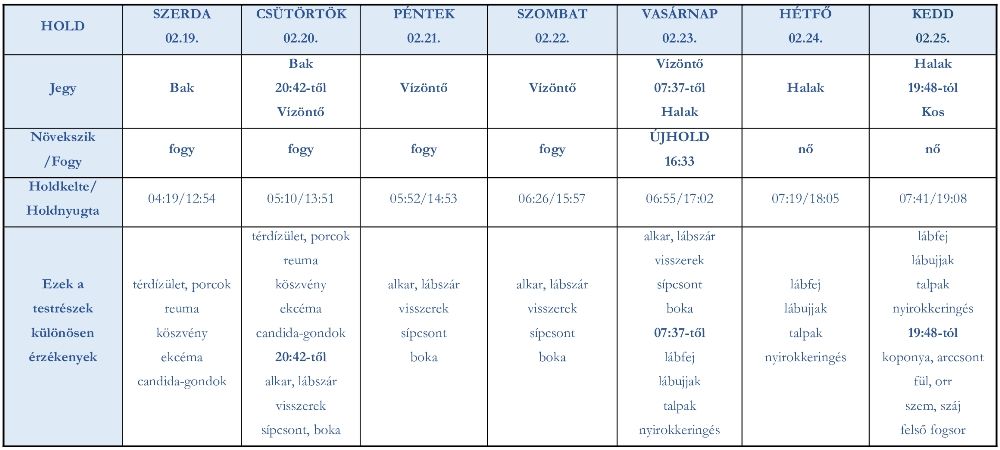 VASÁRNAP – február 23.: Újholdnapján érdemes új szokásokat felvenned vagy valamiben újítanod. A Halak Hold miatt a legjobb, ha meditálsz, vagy talpmasszőrhöz mész. A vizes jegyben járó Hold aktuálissá teszi a növények öntözését, mosást és a madáritatók feltöltését. Az újholdról részletesen is olvashatsz a táblázat alá görgetve.