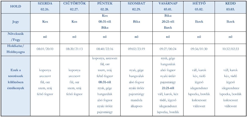CSÜTÖRTÖK – február 27.: Csütörtökön is a Kosban jár a Hold, vagyis nem maradtál le semmiről, amire tegnap nem jutott időd. Válassz olyan kihívást, amit gyorsan meg tudsz oldani! A hosszabb ügyekhez ma nem lesz elég türelmed. A mai napra szintén érvényes a fogászati tilalom. Ellenben süthetsz valami finomat. A növő Hold megnöveli a kenyér, a sütemény méretét.