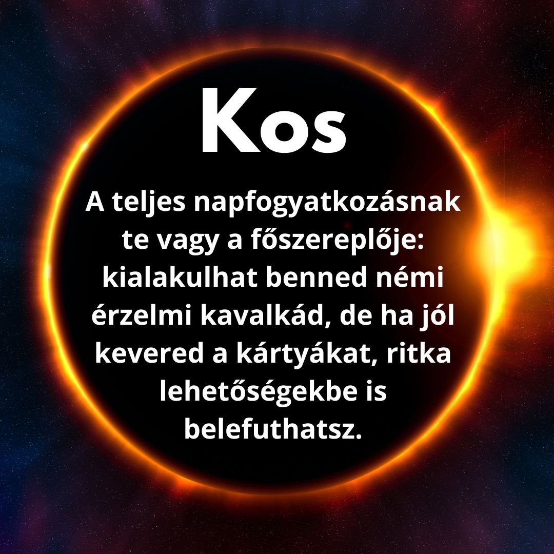 A teljes napfogyatkozás feszültséget és felfokozott érzelmeket hoz magával. A Nap, ami az egó, az öntudat, a férfi princípium és a magabiztosság egyik szimbóluma, ma valamelyest háttérbe szorul, ráadásul épp a határozott, céltudatos és heves Kos jegyében, ami alapvetően nem viseli jól, ha megpróbálják elhallgattatni.