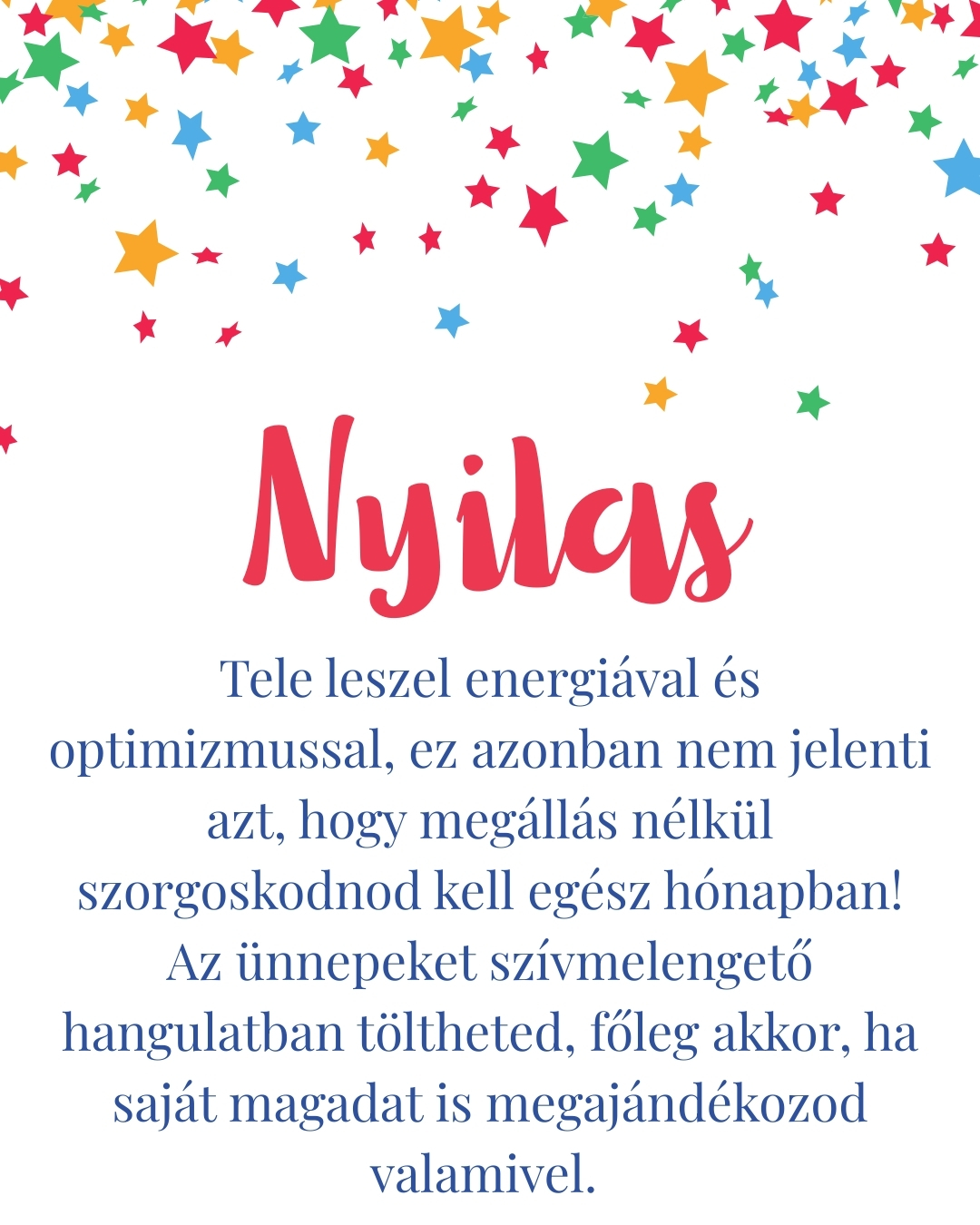 A Nap a hónap jelentős részében a Nyilas jegyében jár, ami igazán kedvező energiákat mozgósít azok számára is, akik nem ebben az állatövi jegyben születtek. Egy kicsit mindannyian kíváncsibbá, kalandvágyóbbá és optimistábbá válunk, miközben a szabadságvágyunk is felerősödik.