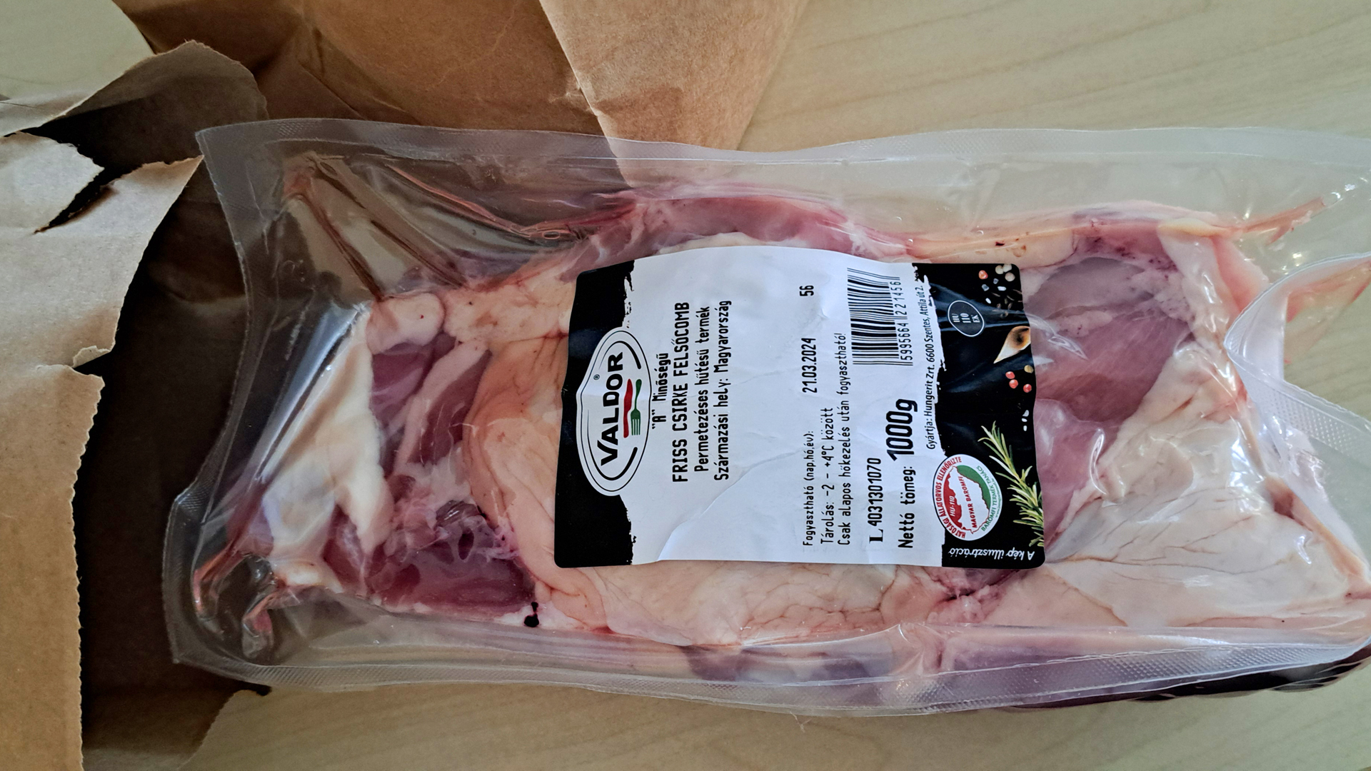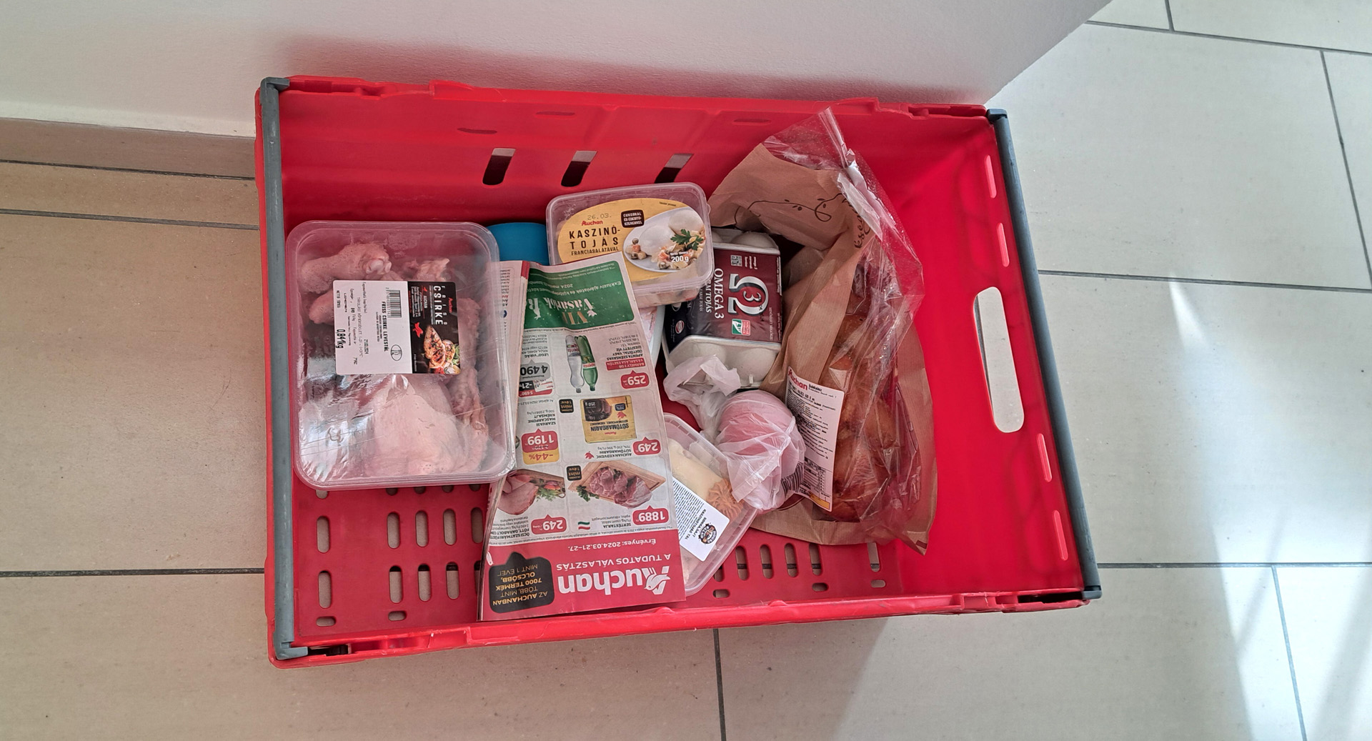 Nagy meglepetést okozott a kézhezvétel módja. De ne szaladjunk ennyire előre: jó tudni, hogy az Auchan idősávjai nagyobb mozgásteret adnak költségekben, viszont kissé átláthatatlanabbak. A legolcsóbb megoldás, ha teljesen mindegy, mikor csöngetnek, 8 és 21 óra között nekünk bármikor megfelel. Ha ennél kicsivel nagyobb kontrollt szeretnénk, akkor dönthetünk valamelyik 4 órás időablak mellett, a legszűkebb átmérő pedig 2 órás intervallum. Összességében 499,- és 1.299,- Ft között mozognak a kapcsolódó összegek. A futár időben megérkezett, kedves volt és humoros, az viszont szíven ütött, hogy egy nagy, műanyag ládában érkezett minden holmi. Kezdjük ennek pozitívumaival: nincsen fölösleges hulladék, nincsen fölösleges költség. Ami viszont problémás: az ember vagy beengedi a lakásba a számára idegen embert (jelen esetben irodai folyosóra, majd szerkesztőségi szobába), vagy egyesével kell bepakolnia a küszöbről minden egyes tételt. És ennél még nagyobb aggályt vet fel: ezzel a módszerrel a vízszintesen fekvő mosogatószer csúnyán átitathatta volna a papírzacskóban lévő élelmiszert, ha kifolyik. Szerencsére viszont nem folyt ki és nem történt ilyesmi. A paradicsom és a tojás itt is szép volt, utóbbit csaknem 1 hónapig fogyaszthatjuk még, a csirke leveshúsoknál viszont már jobban csipkednünk kell magunkat, mert csak 3 napig tart a szavatossága. A 10 ezer forint alatti rendelésért azonban nem számítottak fel extra díjat.