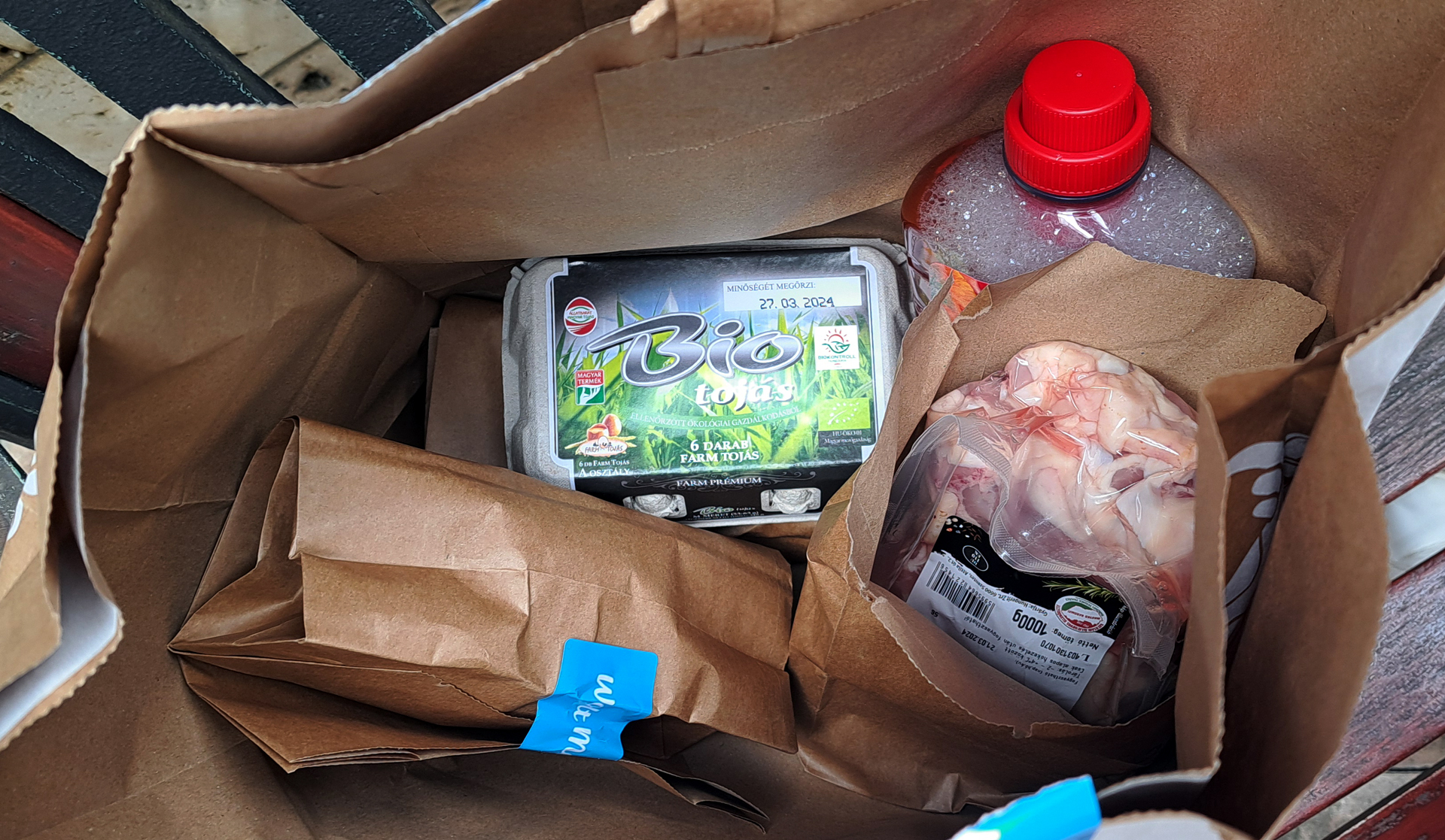Először a Tesco küldeménye ért célba. 1 órás idősávokban dolgoznak, a futár jelezte, hogy nagyjából 20 perccel korábban érkezik, ami okozott némi bonyodalmat, na de inkább jöjjön hamarabb, mint később… Szállítási díjuk a választott idősávtól függően 800 és 1000 forint között mozog, legkorábban 8, legkésőbb 22 órakor tudnak érkezni. Külön papírzacskóba csomagolták a hűtött árut, a zöldséget, külön foglalt helyet a ládában a WC tisztítószer is. A paradicsom olyan volt, amit magunk is választottunk volna, a tojások állapota is rendben volt. A szavatossági időknél semmilyen sürgetőt vagy kellemetlent nem láttunk: 11 nap volt még a hátra a tojás, 6 nap pedig a csirkeszárny lejáratáig. A végösszegnél viszont csaknem 2 ezer forintot tett ki az, hogy nem magunk mentünk el a boltba: 999,- Ft házhozszállítás, 750,- Ft érték miatti felár (nem érte el rendelésünk a minimális 10 ezer forintot), valamint 349,- Ft a szatyrokért.