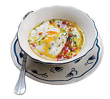 2-3 liter vizet, kevés ecettel és sóval felteszünk forrni. Ha felforrt, a tojásokat egyenként merőkanálba ütjük, és úgy öntjük bele a legjobban forró pontra. (Erre azért van szükség, mert így az ecetes víz összerántja a tojást, a sárgája viszont lágy marad.) Ezután mérsékelt tűzön, gyöngyöző vízben 2-3 percig főzzük, és szűrőkanállal tálra szedjük. A borecetet kevés sóval, feketeborssal és 1,5 dl vízzel elkeverjük. Hozzáadjuk a hagymát és a paprikát, valamint az olívaolajat. Beletesszük a tojásokat, megszórjuk finomra vágott petrezselyemzölddel, és legalább 4-5 órán át a hűtőben hagyjuk, hogy az ízek összeérjenek.