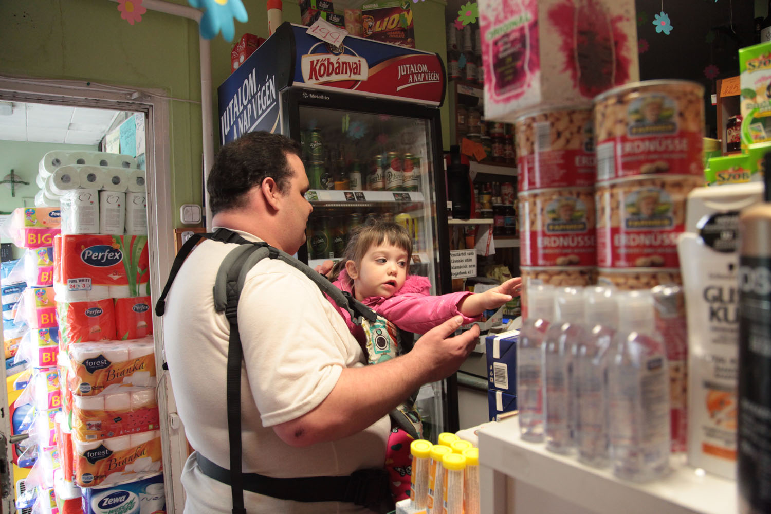 Loholunk a nyomukban, Viktor elég komoly tempót diktál. Az úttesten való átkelésnél frászt kapunk, ahogy a férfi a merőlegesen előretartott fehér bottal határozottan megindul, hasán a kicsivel, de látszik, neki rutin ez. Az autósok pedig észbe kapnak, lassítanak. „Itt kell legyen egy telefonfülke” – keresi Viktor a támpontot, ahol be szokott fordulni az üzlet felé. Nem várt akadály, egy postásbicikli torlaszolja el az utat, Viktor egyenesen nekimegy: ezekre nem lehet felkészülni… Nem a szupermarketbe jöttünk, hanem egy öt négyzetméteres kisboltba. Kézenfekvő, hiszen itt egyszerűen elsorolja, mire van szüksége, az eladó pedig összekészíti neki. „Hoz majd Sanyi kávét is. Bedobja, vagy bejössz érte?” „Bejövök, persze. A nápolyit kibontanád nekünk? Köszi.”
