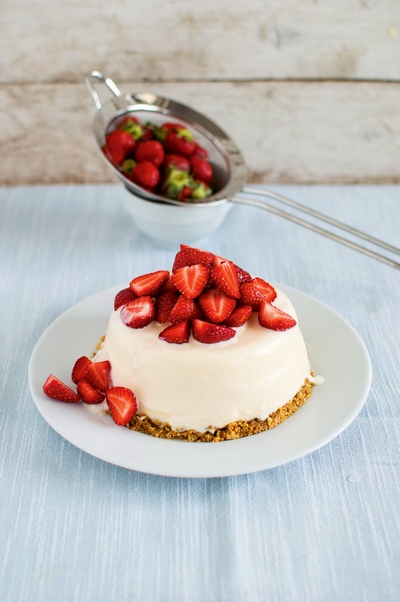 Közben a kekszet mozsárban összetörjük, hozzákeverjük az olvasztott vajat és csipet sót. Egy tortagyűrűt tányérra teszünk, ebbe nyomkodjuk 3-5 mm vastagon a morzsát. Rákenjük a fagylaltot, lefedjük, a mélyhűtőbe tesszük. Fogyasztás előtt hagyjuk 10 percig kiengedni, majd az eperrel díszítjük.