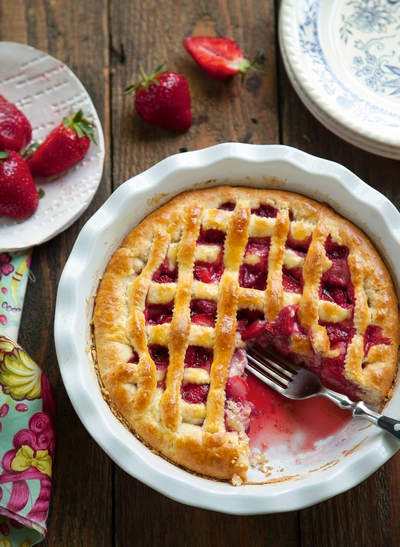 A megmosott epret kockázzuk fel, szórjuk egyenletesen a tésztára, szórjuk meg a maradék cukorral. A tészta kisebbik részét is nyújtsuk ki, derelyevágóval vágjunk belőle csíkokat. Helyezzük a tésztacsíkokat a pitére, majd kenjük meg a másik, enyhén felvert tojással. 180 °C-ra melegített sütőben süssük 30-35 perc alatt készre.
