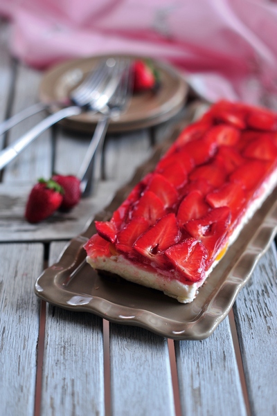 A cikkekre vágott barackot sorban belenyomkodjuk a túróba, majd a tetejét szépen kirakjuk a felszeletelt eprekkel. A Dr. Oetker Expressz Tortazselét a csomagoláson leírtak szerint elkészítjük, majd leöntjük vele a sütemény tetejét. 2-3 órára a hűtőbe tesszük dermedni.