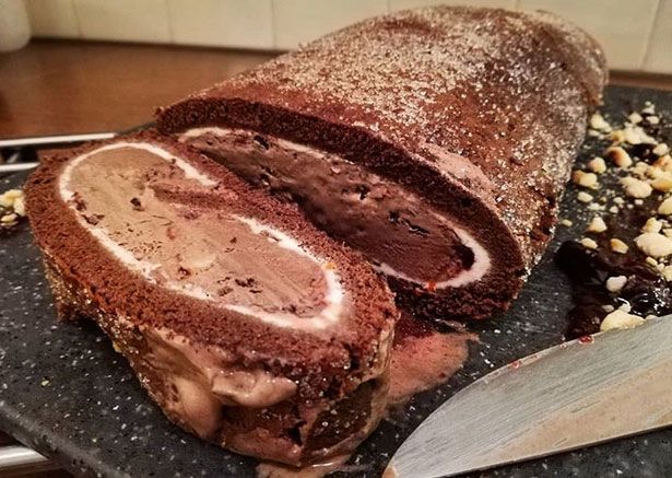 - Az összeállításnál permetezd meg a tésztát egy kis pálinkával, kenj rá egy réteg tejszínhabot és a dzsemes töltelék felét, a fagylaltot kupacokban kanalazd rá. Óvatosan tekerd fel és csomagold zsírpapírba, majd tedd a fagyasztóba.