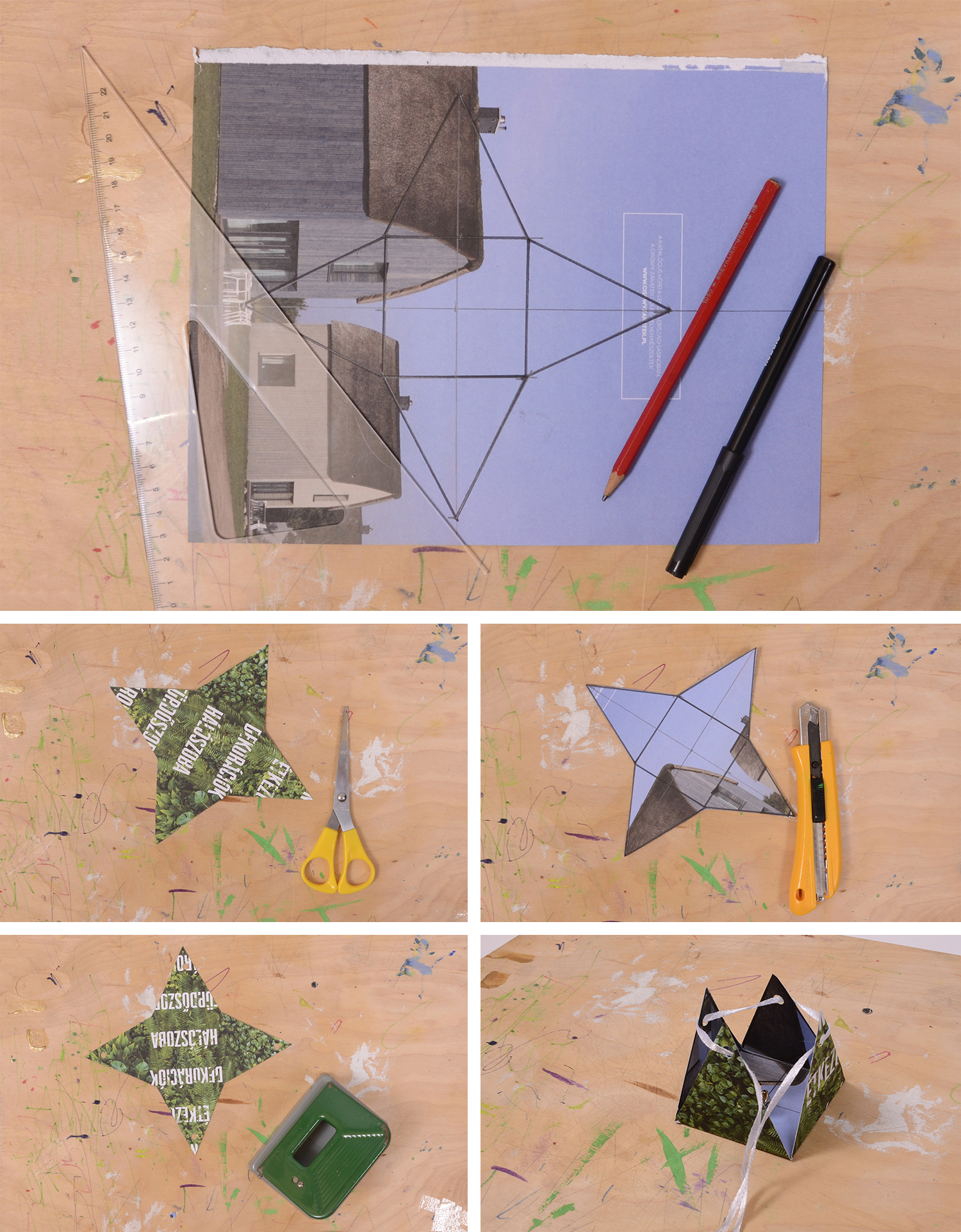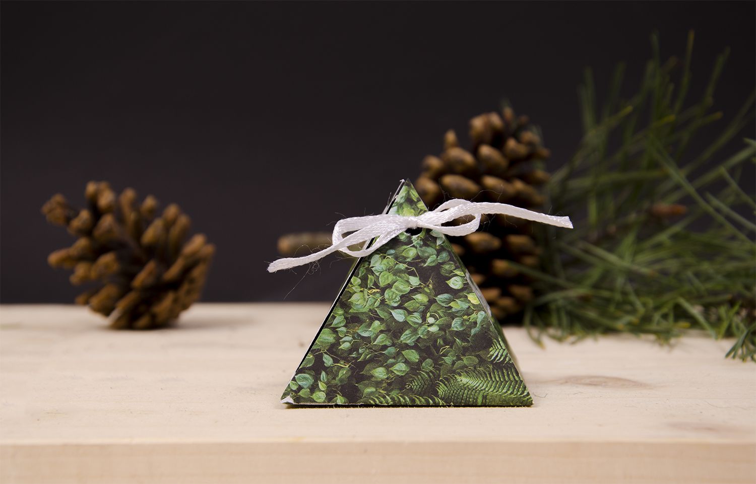 A vastagabb szóróanyagokat újrahasznosíthatod a karácsonyi csomagoláskor. Ha ékszer vagy más apróság a meglepetés, valósítsd meg a képen látható dobozt. Rajzolj egy megfelelő méretű négyzetet, majd a négyzet minden oldalához egy-egy egyenlő szárú háromszöget, fontos a háromszög magassága legalább akkor legyen, mint a négyzet oldalhossza. Ha megvagy a szerkesztéssel, vágd ki, és a háromszögek csücskeibe készíts egy-egy lyukat. Végül nincs más dolgod, mint a négyzet közepébe tenni az ajándékot, a dobozt pedig a lyukakon átfűzött szalaggal összezárni.