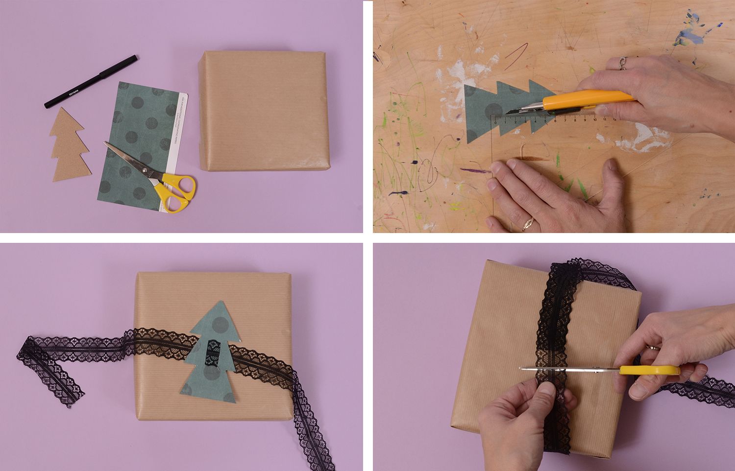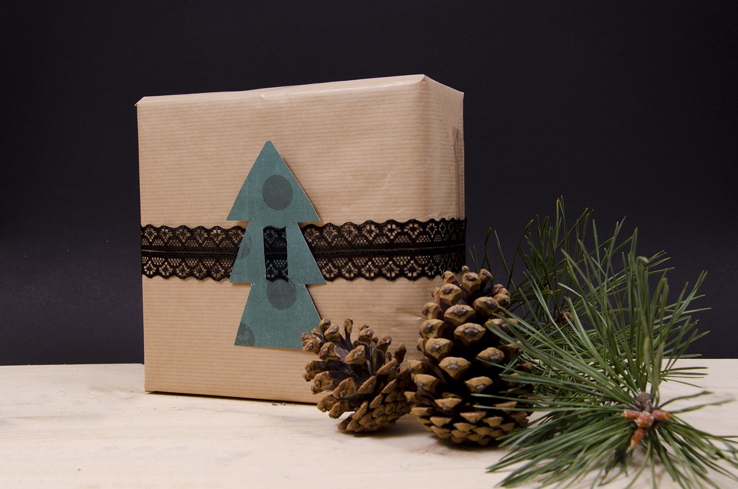 A natúr barna vagy újrahasznosított papírt is elegánssá és széppé teszi egy csipkeszalag. Az ajándék még egyedibb lesz, ha a csipkét egy fenyőfával kombinálod. Rajzolj egy kartonra egy fenyősziluettet, majd rajzold körbe a mintás karton hátoldalán. Ha kivágtad, sniccerrel ejts két bevágást a fenyő közepén. Fontos, hogy a bemetszések olyan szélesek legyenek, hogy a szalagot könnyedén át tudd rajtuk fűzni. A csipkét a csomag hátoldalán celluxszal rögzítsd.