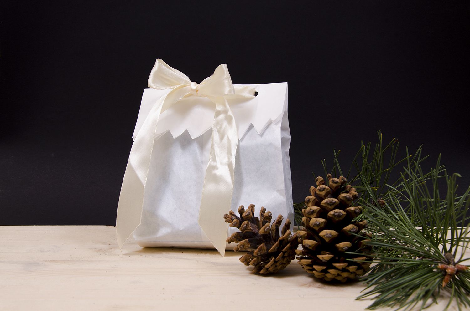 Tényleg egyszerű, akár last minute tippnek is tökéletes: szerezz be a sarki ABC-ből néhány minta nélküli péksüteményes zacskót, és csomagold ezekbe az apróbb tárgyakat. A zacskókat könnyen felturbózhatod: cakkozd be vagy vágd csipkésre a szélét. Majd a száját hajtsd le, készíts egy-egy lyukat a két szélére, az ezeken átfűzött selyemszalaggal zárd le a csomagot.