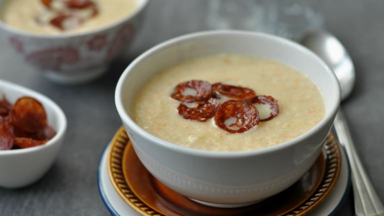 Tejszínes karfiolkrémleves és kolbászchips