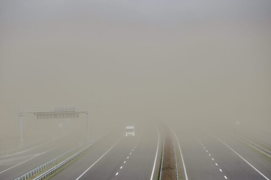 Egy autó a homokviharban az M35-ös autópályán, Debrecen közelében (MTI Fotó: Czeglédi Zsolt)