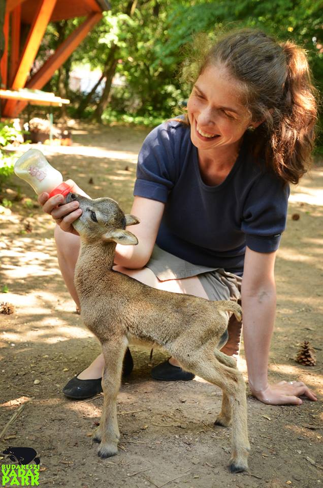 A Budakeszi Vadasparkban nagyon vigyáznak rá, és dédelgetve nevelgetik. A képen gondozójával, „pótmamijával”, Mészárosné Kiss Boglárkával, a Budakeszi Vadaspark munkatársával látható.