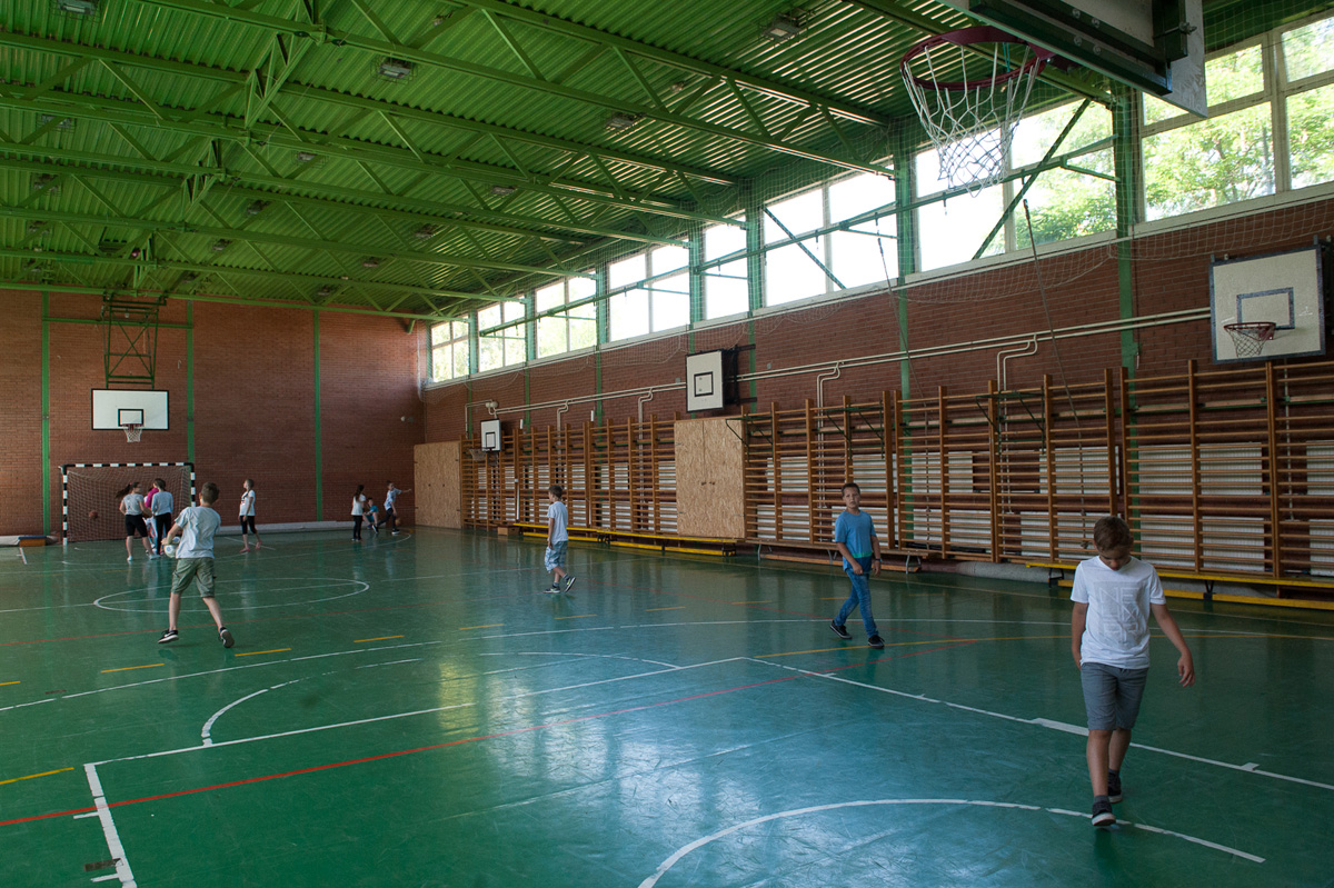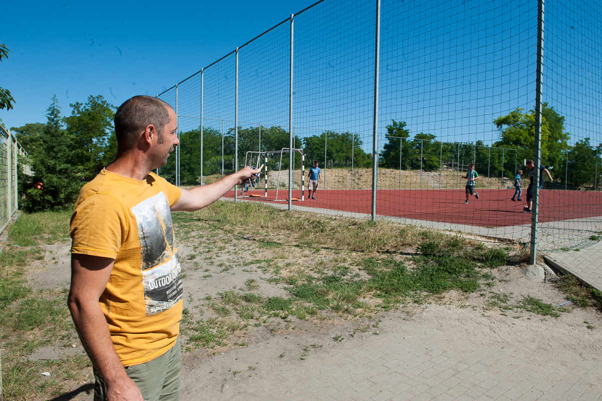 Megújult az ebédlő, és végre akadálymentes lett az iskola, így Lillának, az egyetlen mozgáskorlátozott tanulónak sem jelent gondot a bejutás. Az udvarra nemcsak korszerű burkolat, de új padok, és díszítő festmények is kerültek, így sokkal barátságosabb lett a környezet. A korszerűsítésnek koránt sincs vége, most éppen új tornatermet álmodtak meg Gyöngyiék, és jövő májusban már ott akarják tartani az órákat, mert a mostani csarnok nem elég ennyi gyereknek, főleg a mindennapos testnevelés mellett. Gera Imre, a tesi szakos igazgató-helyettes mutatja éppen nekünk, hogy hol fog állni jövőre az új tornacsarnok.