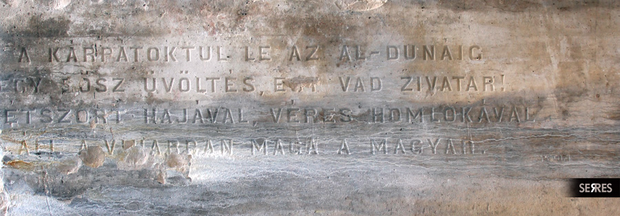 A dombormű hátoldalán jól olvashatók Petőfi Sándor: Élet vagy halál! című versének kezdősorai: „A Kárpátoktul le az Al-Dunáig / Egy bősz üvöltés, egy vad zivatar! / Szétszórt hajával, véres homlokával / Áll a viharban maga a magyar.”
