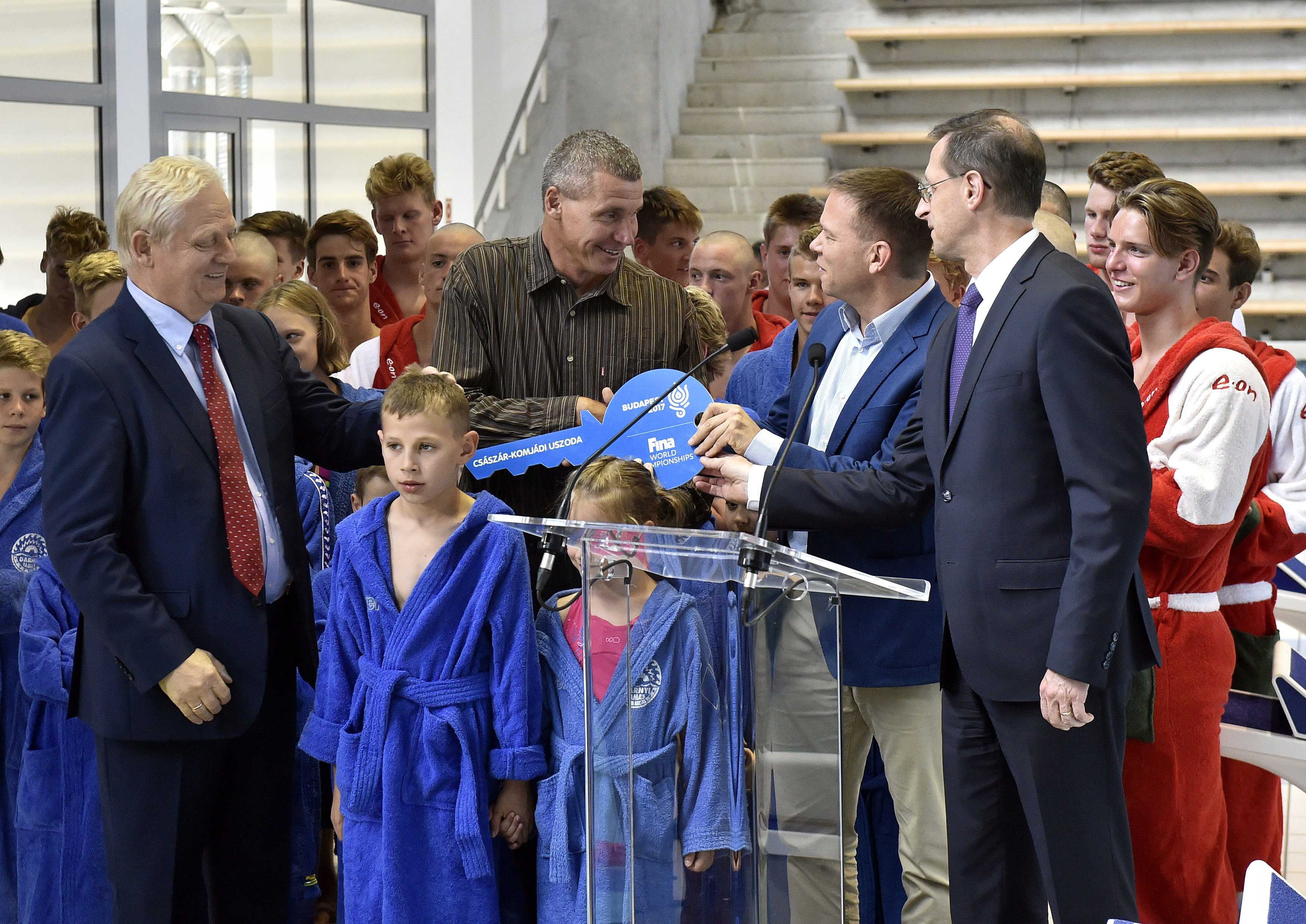 Tarlós István főpolgármester, Varga Mihály nemzetgazdasági miniszter és Fürjes Balázs, az egyes kiemelt budapesti beruházásokért felelős kormánybiztos jelképesen átadta a felújított Császár-Komjádi Sportuszoda kulcsát Darnyi Tamás olimpiai bajnok úszónak.