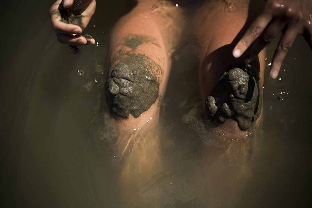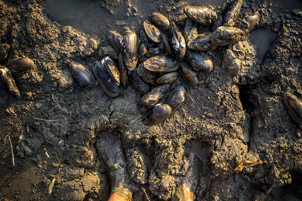 Mocsaras partja miatt nehezen megközelíthető a víz, mintha a partra mászna a folyómeder, annyira sűrű itt az iszap amiben pár lépés után majdnem térdig süppedünk.