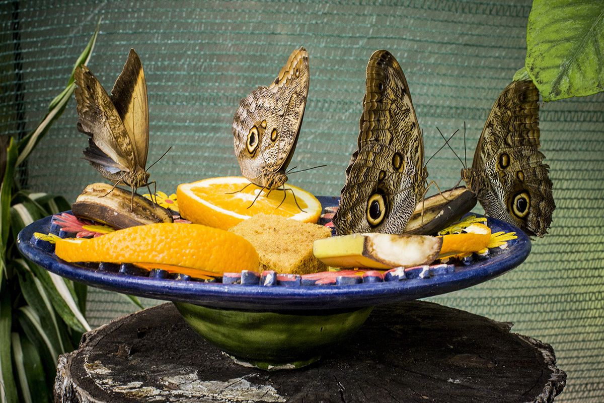 A pillangók citrusféléket és banánt „esznek”: kiszívják a nedvet a gyümölcsökből az etetőtálakon.