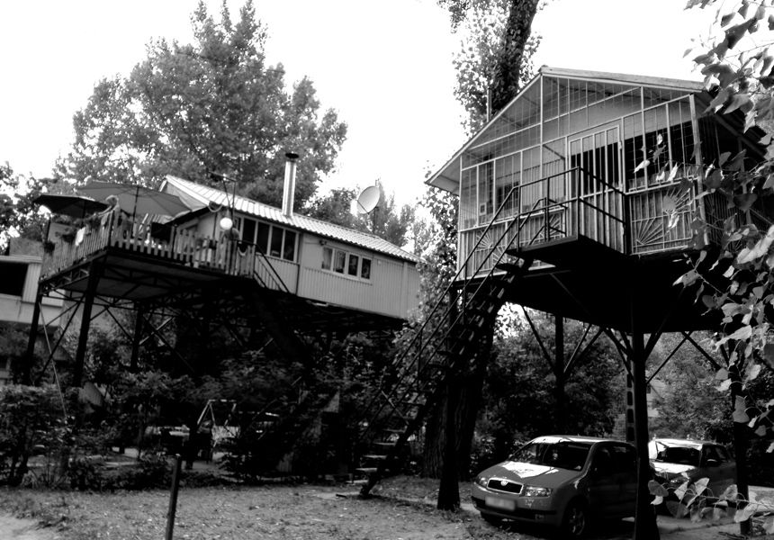 A part menti fák között kétutcányi nyaralósor fut: cölöpökön álló házak és lakókocsik sorakoznak egymás mellett.