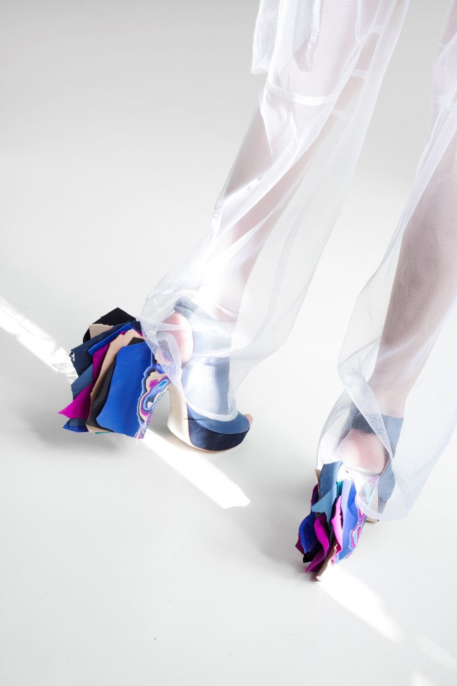 Az eredmény nem egyszerűen csak egy színes és izgalmas kollekció lett, hanem okos is. Veszprémi Gabriella ugyanis igyekezett a zero waste elvét követni, és nem csak arra ügyelt, hogy a papucsok, magas sarkú cipők előállítása során ne keletkezzen hulladék (ami előbb-utóbb úgyis a szemétbe kerülne), hanem ráadásul a cipőket magukat is fölösleges, hátramaradt anyagokból készítette.