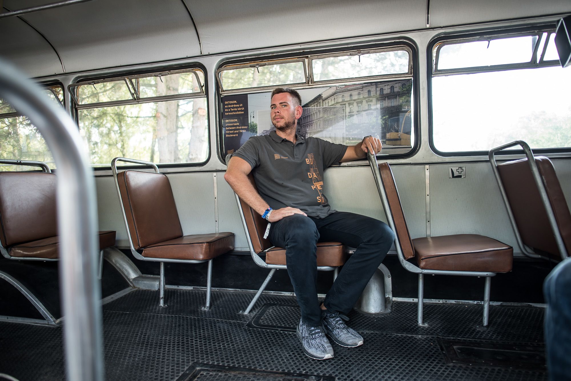 A Szigeten kiállított retrobuszban mértünk ennyit. A sajtótájékoztatót azért tisztességesen végigcsinálta.