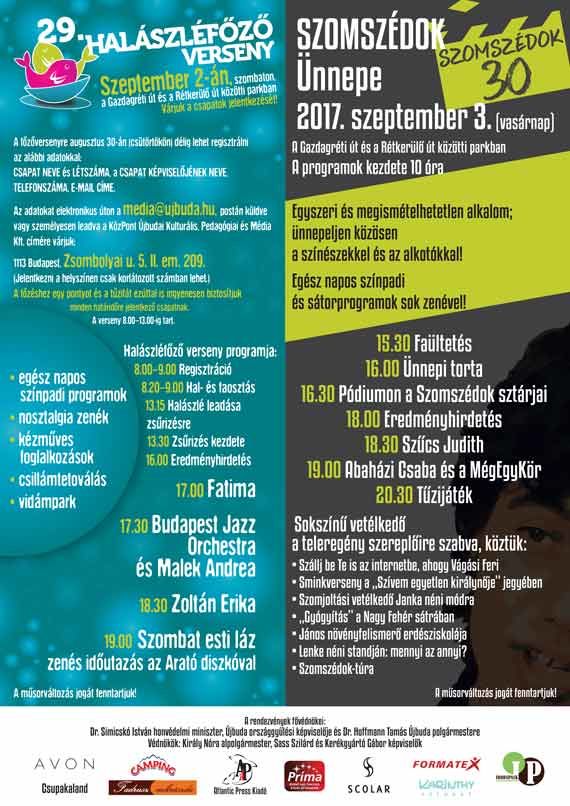 Azt írta Újbuda önkormányzata, hogy az eseményre a Szomszédok szereplői és alkotói közül is sokan ellátogatnak – Frajt Edit, Incze Ildikó, Simorjay Emese, Závodszky Noémi, Böröndi Tamás, Nemcsák Károly, Németh Kristóf, Rátóti Zoltán, Trokán Péter és még sokan mások –, akik a forgatások hátteréről és a kulisszatitkokról mesélnek majd. A Karinthy Színház pódiumbeszélgetésén a közönségnek is lehetősége lesz, hogy kérdésekkel bombázza az egykori szereplőket. A helyszínre látogató színészek közösen ültetik el a Szomszédok fáját, így állítva emléket a már elhunyt szereplőtársaknak. Az alkotók a kerek évfordulót méltó módon egy óriás tortával ünneplik meg, este pedig az is kiderül, melyik dalszöveg nyerte a főcímzenére kiírt pályázatot.