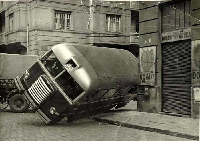 Budapest régi képeken: busz dőlt a házfalra a belvárosban