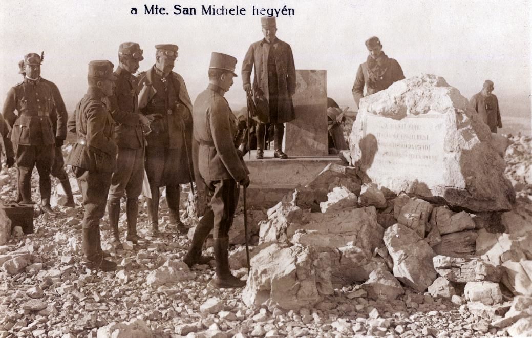 IV. Károly magyar király megszemléli az isonzói csatákban elesett olasz és magyar katonák közös emlékművét. Forrás: Fortepan