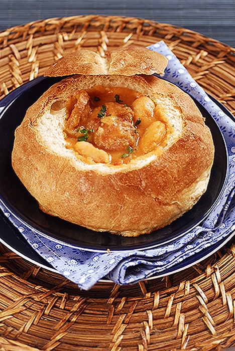 Csípős kolbászos bableves cipóban