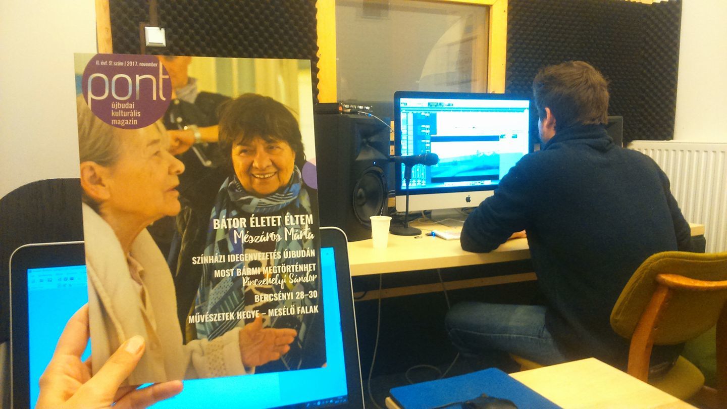 Felvétel az AKKU és az UP Center stúdiójában. A hangszigetelt fülke falai mögött Mórocz Adrienn színésznő bújik meg.