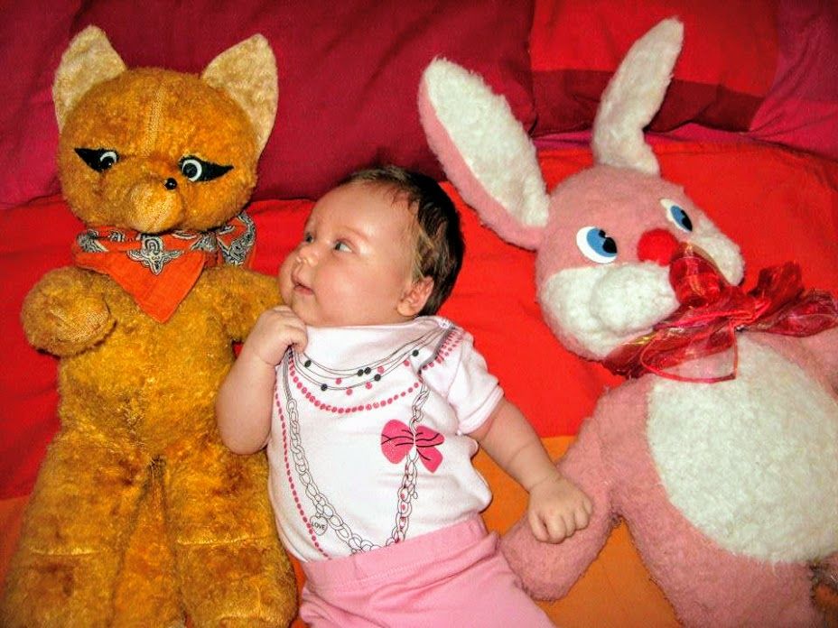 Móni a mai napig ott csücsül a hálószobánkban: ez a toldozott-foldozott, ágról szakadt plüsskutya egy otthonos kis kosárban pihen férjem gyerekkori kedvenceivel együtt. Neki egy szalmával kitömött róka volt a mindene, amit édesapjától kapott Csehszlovákiából. Fiú létére nagymamája egy rózsaszín nyúllal lepte meg, de hát negyven éve itthon ezt lehetett csak kapni. Nem volt túl kreatív az ötlet, de utóbbi két jószág a Róka Koma és a Nyúl Úr nevet kapta. Később az ő nyakukba is divatos sálat kötöttem, összevarrtam elfeslett orrukat, visszaillesztettem egy pár leszakadt fület, és máris újra régi pompájukban tündököltek.