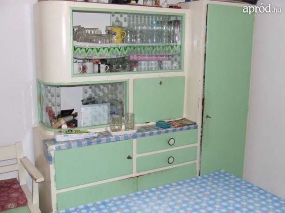 A Kádár-korszak jellegzetes bútorai közé tartozott ez a konyhaszekrény, ami a legtöbb konyhában ott állt. A kórház zöld színű szekrényben mindennek megvolt a helye: a vizespoharaktól kezdve a kanalakon, edényeken át az üres befőttes üvegekig.