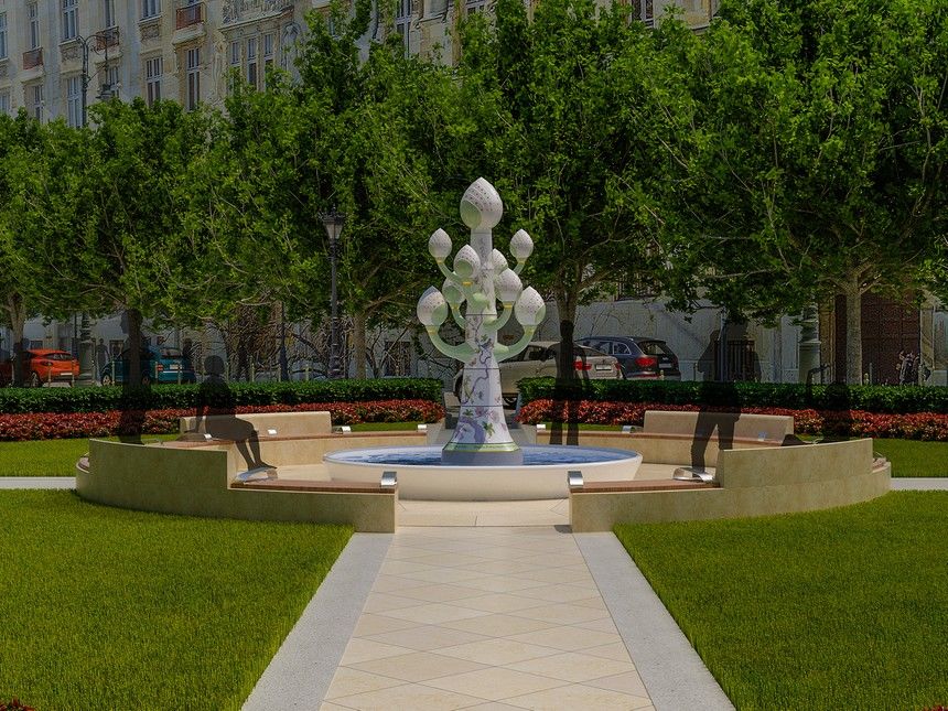 A leírása szerint elég izgalmas lesz: egy rozsdamentes acélvázra kerülnek a porcelántestek, a bubókat (amiket nézhetünk bimbónak, virágnak vagy gyümölcsnek is) éjszakánként belülről kivilágítják. A medence is mintás lesz és „habosító fúvókák” fodrozzák majd benne a vizet.