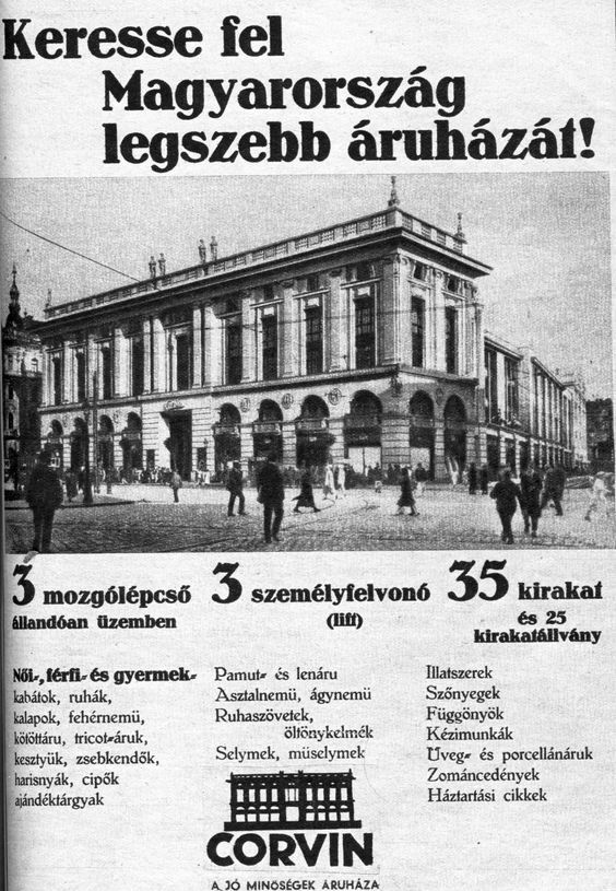 „Küszöbét nemcsak a főváros vásárlóközönségének ezrei lépik át, de óriási termeiben randevút ad egymásnak a vidék jó pénzért jót vásárolni szerető népe éppen úgy, mint azok a külföldiek, akik tudják, hogy Budapest divatkereskedelme nem marad ízlés, minőség és lelkiismeret tekintetében sem Párizs, sem London mögött… Mert ahogyan Európa divatját Párizs, a fővárosét a Corvin diktálja és igen szerencsés, mesteri kézzel.””