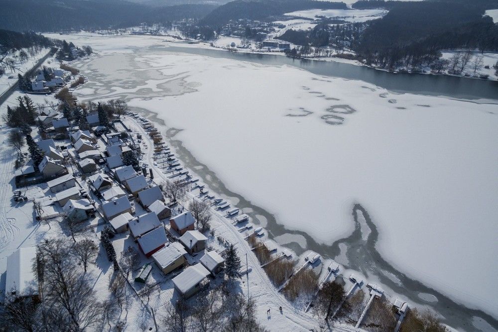Készültek képek egy másik tájon, Orfűn is, ahol jól látszik, ahogy a stégeket lassan körbeveszi a hófödte jég.