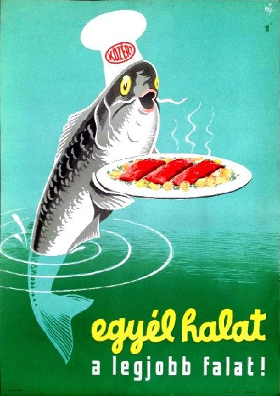 A halfogyasztást igyekeztek népszerűsíteni a Közért egyik retró hirdetésében, amelyben egy hal mint séf buzdít a halevésre úgy, hogy a korabeli plakáton éppen egy társát szolgálja fel mosolyogva. Kedvet kaptunk!